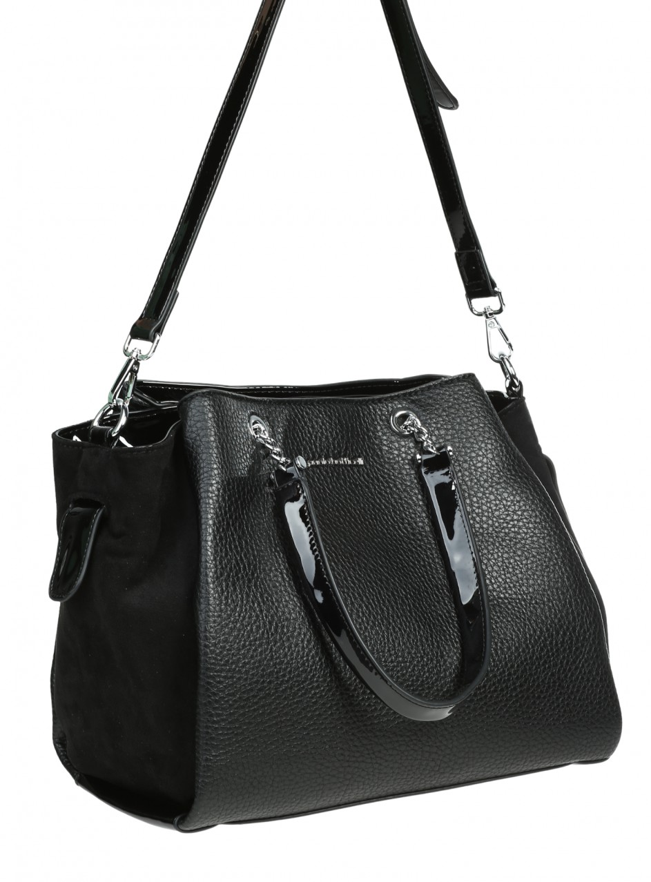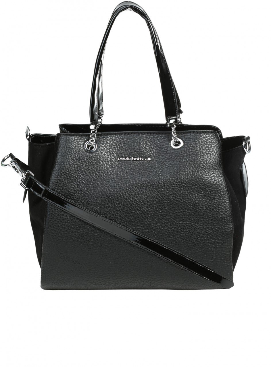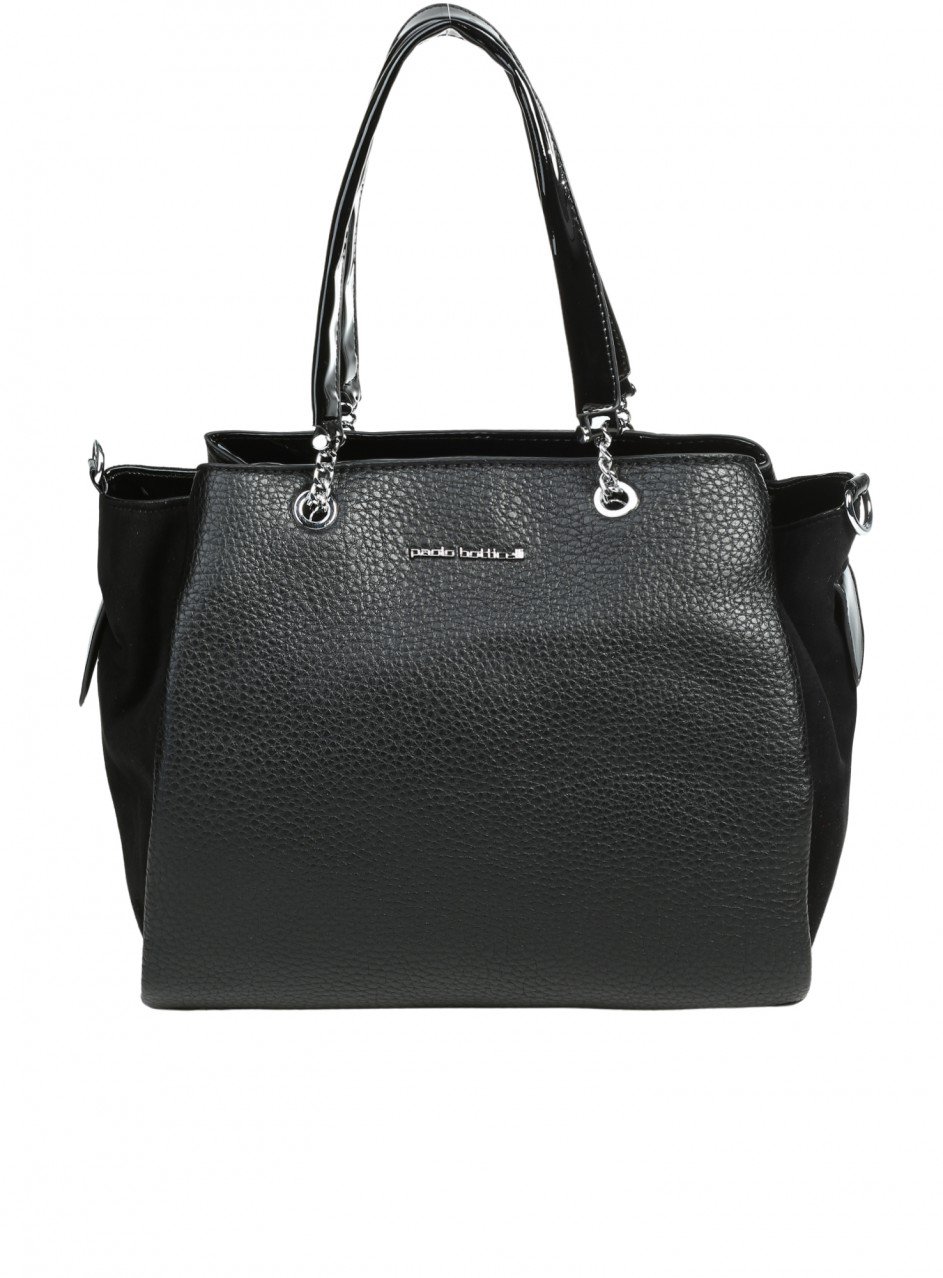 Geantă de damă confecționată din piele ecologică și material textil. Disponibilă pe negru, cu mâner atașat. Geanta are cinci compartimente și trei buzunare interioare.