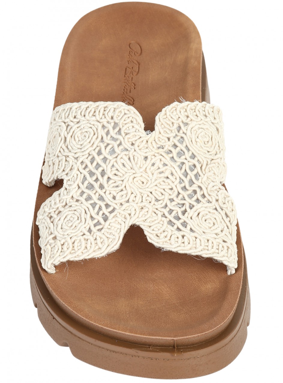 Papuci de damă casual cu platformă textilă. Disponibili în culoarea bej. Interiorul este confecționat din piele ecologică.